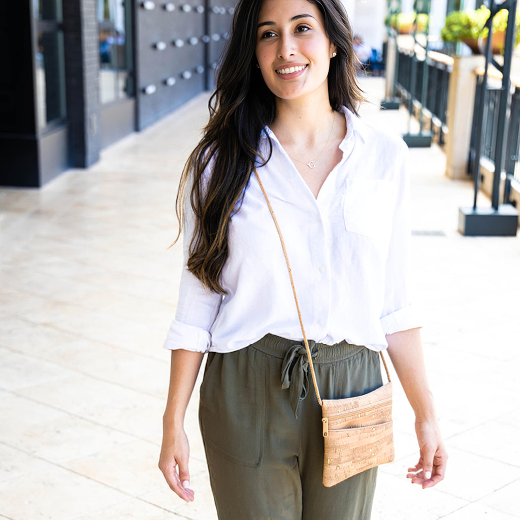 Made from sustainable cork, the bag is lightweight, water-resistant, and durable, making it ideal for daily use. It features an adjustable strap to ensure a comfortable fit and a front pocket for easy access to your essentials. With enough space to hold your cell phone, small wallet, and other necessities, this bag is as practical as it is stylish.