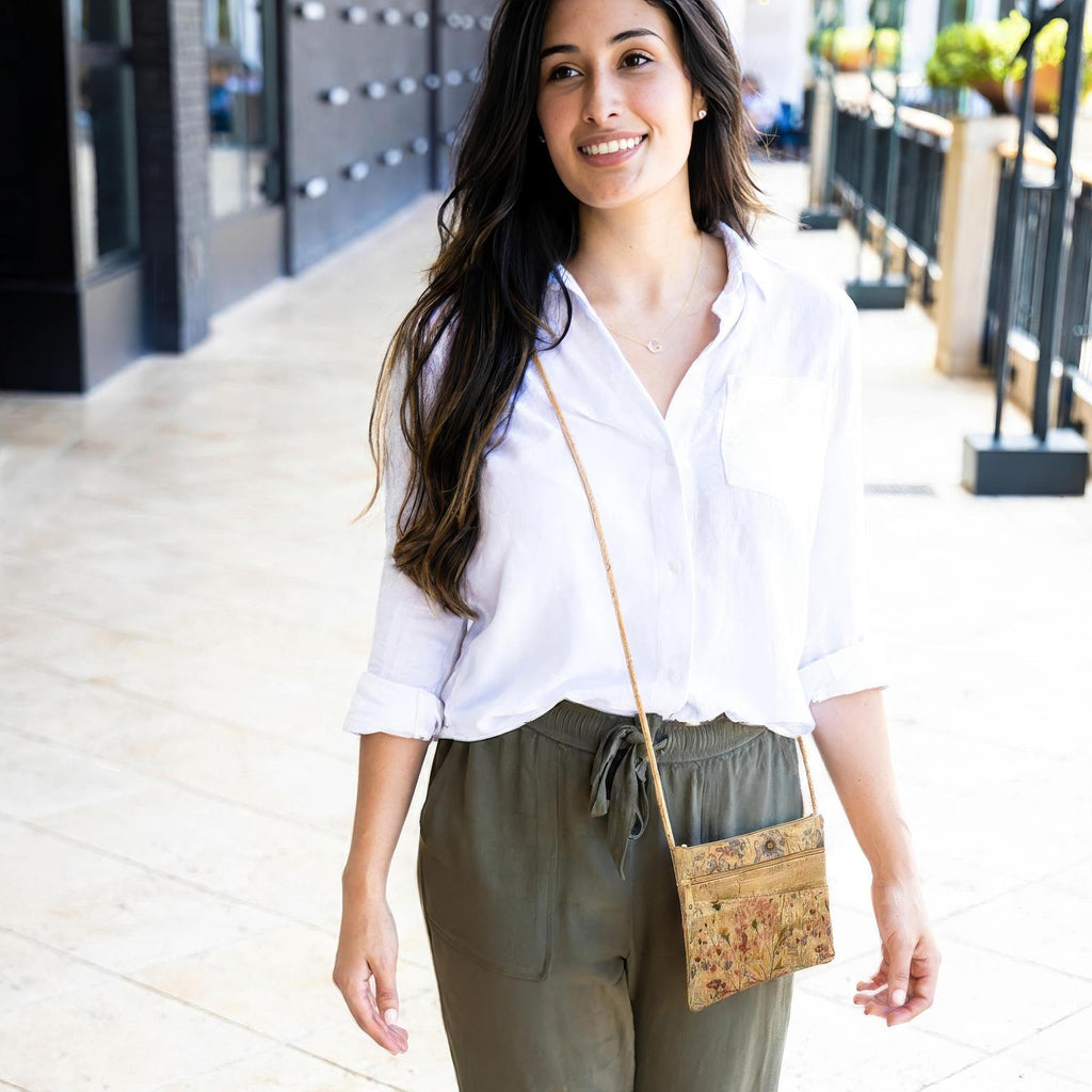 Made from sustainable cork, the bag is lightweight, water-resistant, and durable, making it ideal for daily use. It features an adjustable strap to ensure a comfortable fit and a front pocket for easy access to your essentials. With enough space to hold your cell phone, small wallet, and other necessities, this bag is as practical as it is stylish.