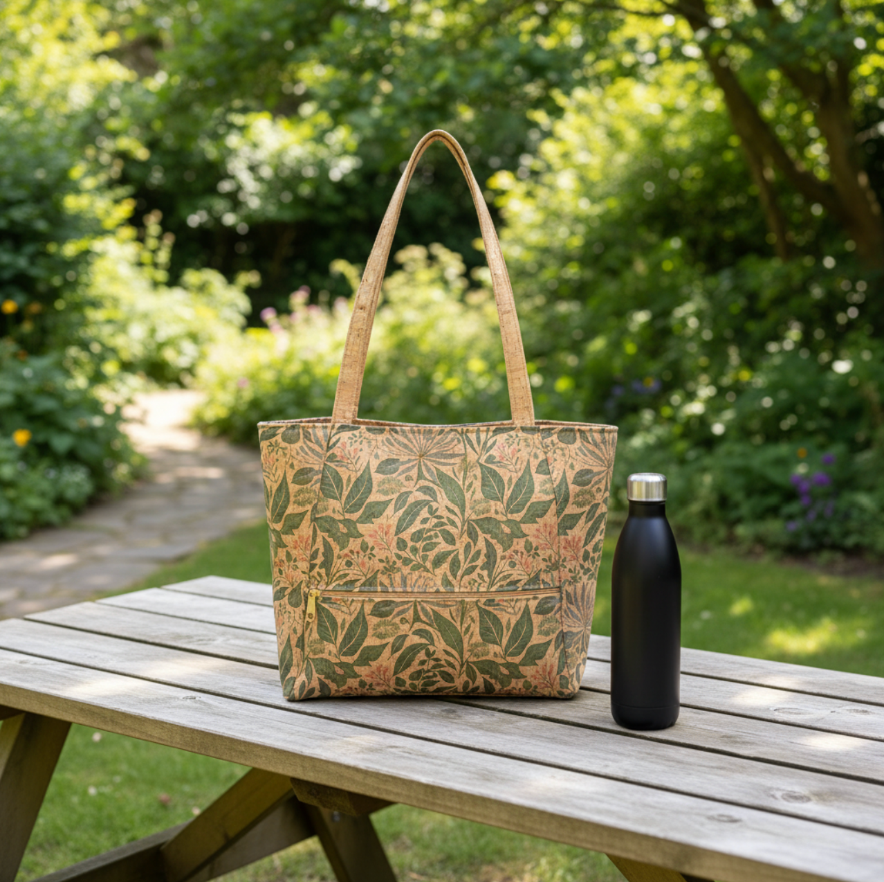Cork SMALL Tote Bag with Front Zipper Pocket | Lush Botanicals Print