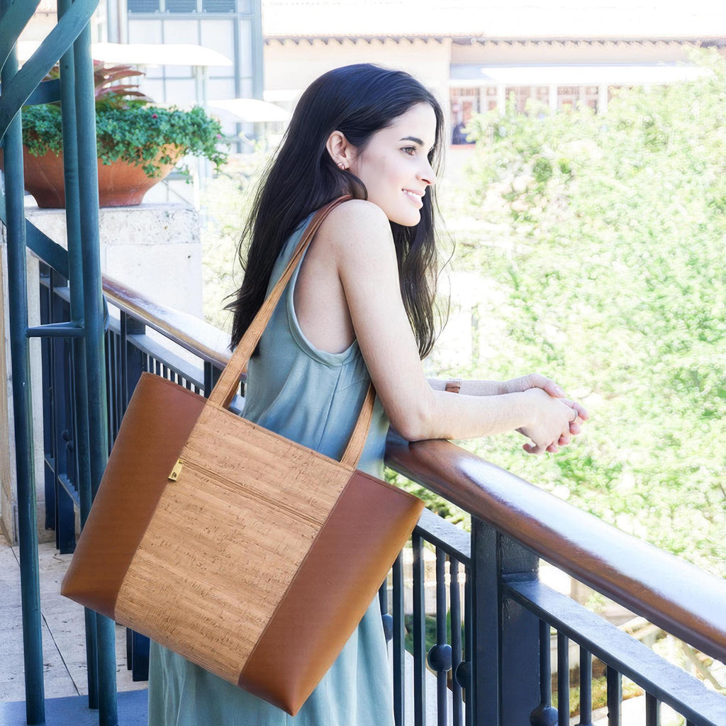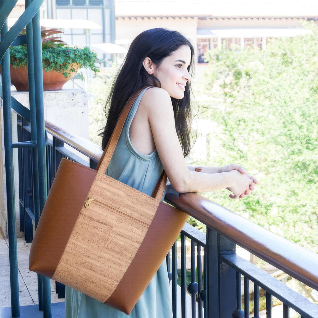 Cork Tote Bag with Front Pocket in 2 Sizes | Rustic Cork with Faux Leather