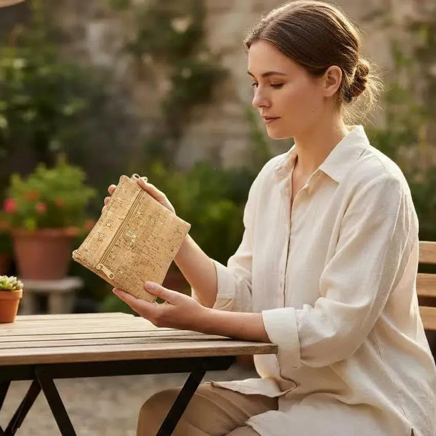 This wristlet clutch is the perfect blend of style and function. Made from genuine cork fabric, it’s lightweight, durable, and naturally beautiful with a soft, leather-like feel. The main zippered compartment offers plenty of space for your everyday essentials, while a second front zipper pocket keeps smaller items organized and easy to reach. Finished with a comfortable wrist strap, this clutch is ideal for errands, nights out, or travel.