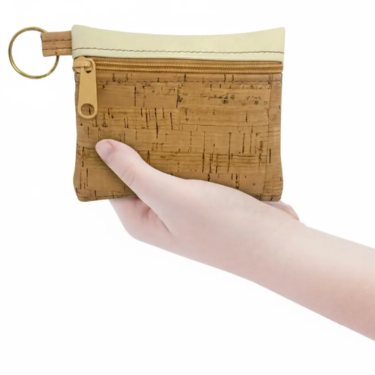 Cork Zipper Pouch with Key Ring | Rustic Cork with Light Taupe Faux Leather [SAMPLE SALE]